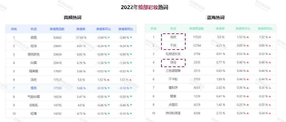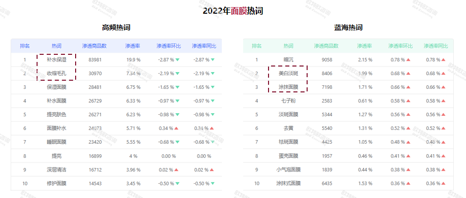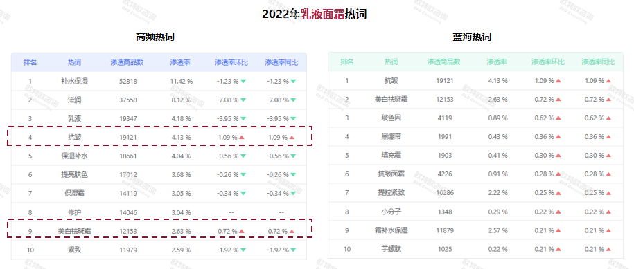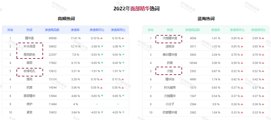 从消费者端来看,补水保湿、提亮肤色仍为面部精华产品的重点需求,渗透商品数和渗透率也位于前排。与此同时,次抛精华液、次抛等蓝海词汇渗透率也在逐渐上升。“精华油这种新产品形态增长较好,可能会是未来的一个增长契机。”罗兴认为。