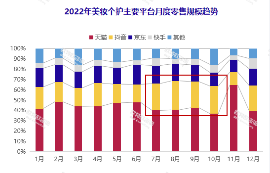 从渠道来看,天猫仍为美妆主战场,2022年1-7月零售额占比接近50%。抖音则成为2022年最大的增量场,占比达21.5%,同比提升5个百分点。“从7月开始,抖音占比出现了大幅增长。”