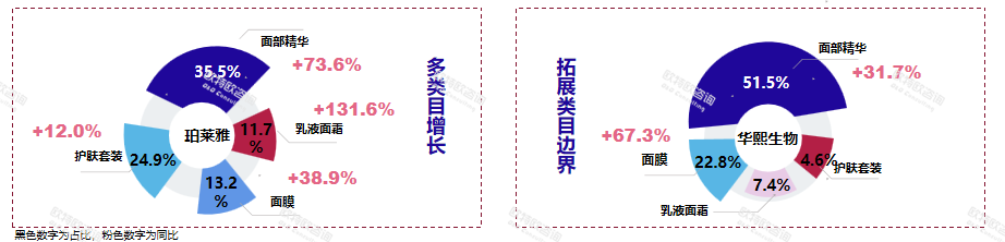 除此之外,作为本土企业中的两大佼佼者,珀莱雅和华熙生物也在不断拓展类目上的边界。白皮书显示,珀莱雅的乳液面霜类产品占比虽然只有11.7%,但增势猛烈,同比增长131.6%。华熙生物的面膜品类也表现良好,同比增长67.3%。