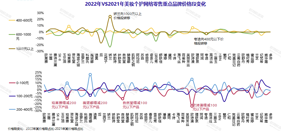 首先是价格向中高端转移。目前来看,TOP品牌产品价格多在400元以上。而珀莱雅、薇诺娜等头部国产品牌也在缩减其200元及100元以下产品。“这些品牌都在向中部价格段转移,更为看重200-400元的增长。”罗兴表示。