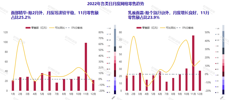 白皮书显示,在面部护理产品中,增速最快的两大细分类目为面部精华和乳液面霜。二者月度增速都较为平稳,11月销售额最为亮眼,零售额占比均在24%左右。