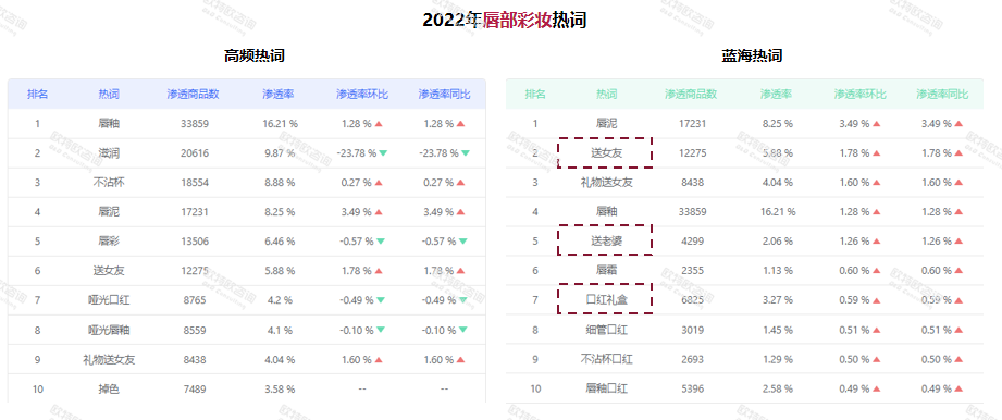 从消费者端来看,消费者对脸部彩妆的分肤意识逐渐增强。“遮瑕、控油、提亮仍为主要需求,但针对油皮、干皮、泪沟等部位的处理也逐渐受到消费者关注。”罗兴分析道。除此之外,唇部彩妆存在非常高的“送礼”特性。“2022年,很可能是依靠‘送女友’、‘送老婆’带动了整体增长。”
