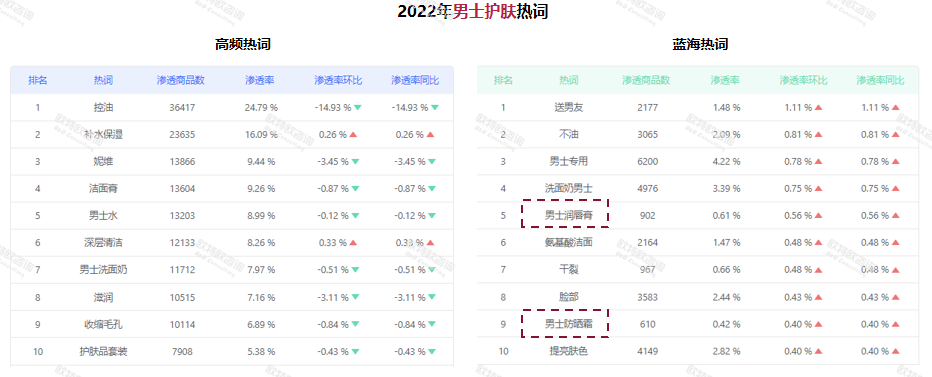 与彩妆类目相似,男士护肤及彩妆品类2022年单月也普遍呈现下滑趋势。“男士类目前并未形成规模,并且品牌集中度较高。”白皮书显示,男士护肤品类中,欧莱雅单个品牌占比便达22.1%。此外,仁和、科颜氏的销售增速较快,前者畅销单品为主打除螨的洗面奶,后者则为水乳套装。“控油、补水保湿为男士护肤的主要需求。但目前此品类也在向多类目发展,比如男士专用润唇膏、防晒霜等产品,都呈现上升趋势。”