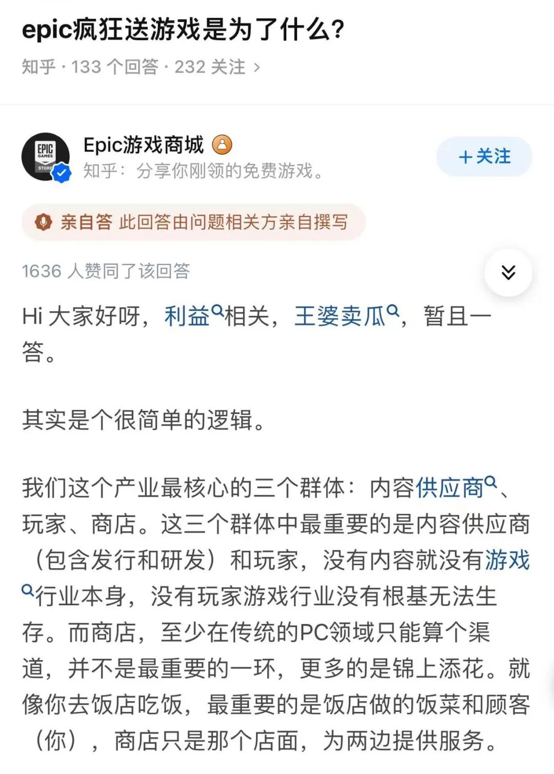 Epic商城的官方知乎帐号曾就“epic疯狂送游戏是为了什么”给出过一份颇为诚恳的回答,回答表示在内容供应商、玩家、商店三者中,商店“只能算个渠道,不是最重要的一环”,“免费可以吸引玩家,我们这个店面可以生存下去……从厂商这边买免费,厂商可以减少自己的运营成本,为后续产品提供资金……这样是对三方最有利的”。