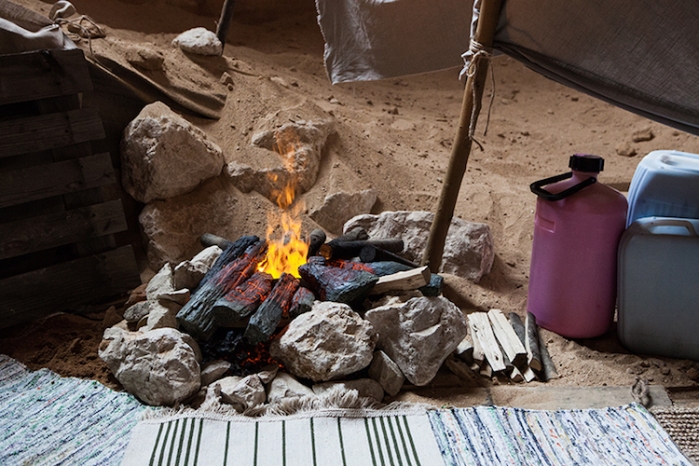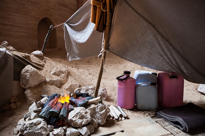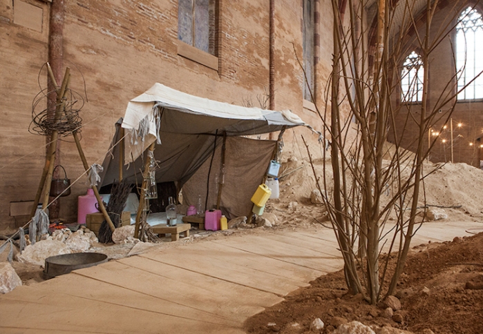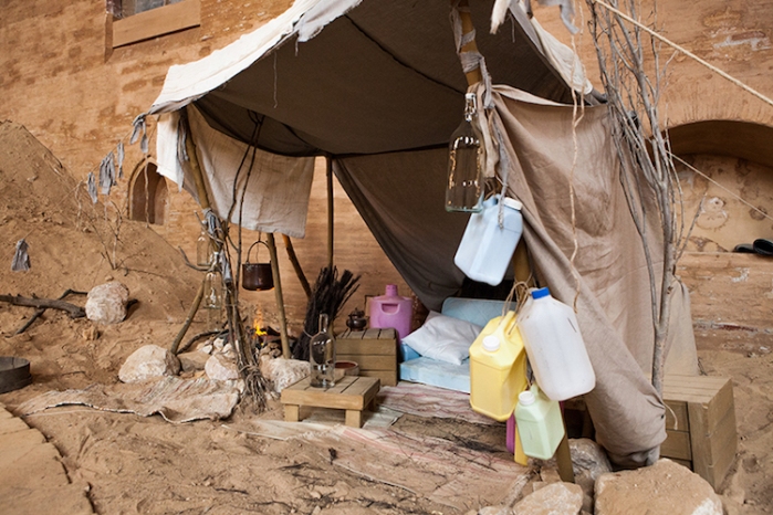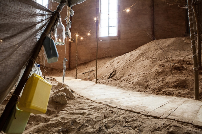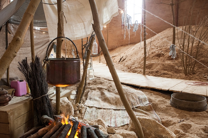 这些瞬息而逝的事物——茶壶、平底锅、玻璃瓶、床上用品——在木质道路的两旁恭候着参观者,为他们营造出一种恍若到达某个居住空间、或这片土地刚刚被弃居的错觉。参观者会如何填充这个空间,就只能留给想象力了。