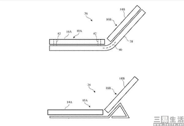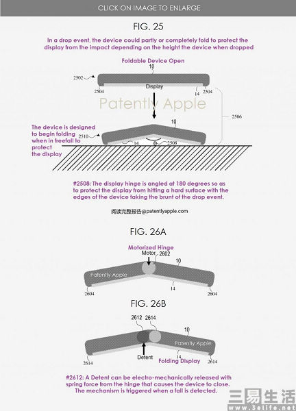 在苹果的这份专利文件中描述了这样一个技术,即通过在设备中使用的传感器来检测竖向加速度,以确定设备是否已经掉落。如果加速度超过设定的阈值时,则意味着设备已经掉落,其柔性屏之间铰链连接的释放机制就将被激活,让设备可以实现自动折叠。