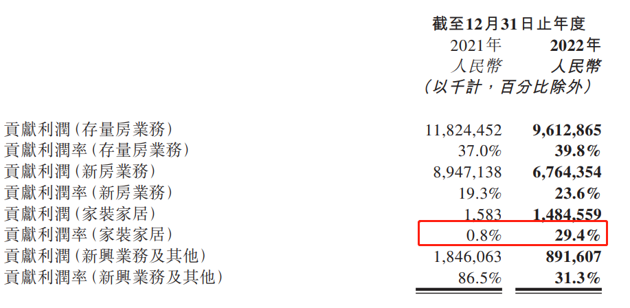 贝壳财报显示,家装家居的贡献利润率在去年达到29.4%,而2021年为0.8%。