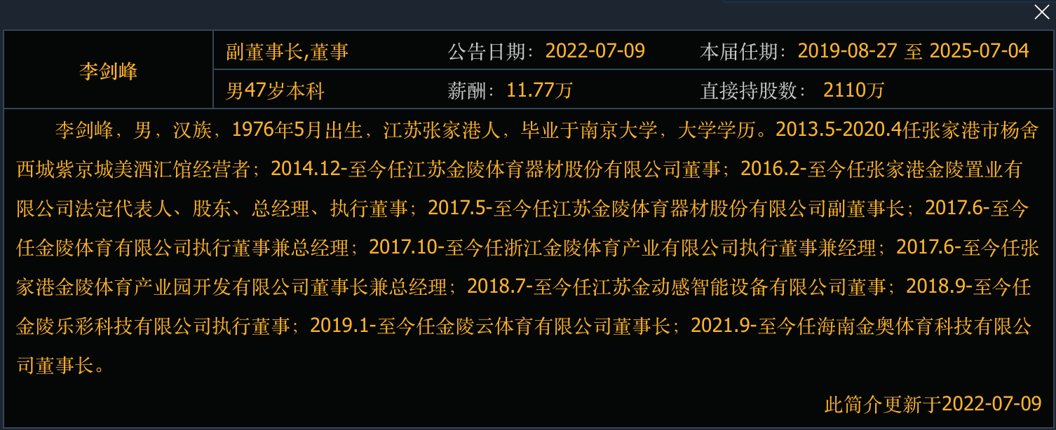 资料显示,金陵体育主营体育器材和场馆设施的研发、生产、销售及赛事服务,公司"金陵"品牌已具有较大的市场影响力和品牌美誉度。金陵体育的控股股东、实际控制人是李春荣、李剑刚、李剑峰、施美华,其中李春荣为董事长,李剑峰为副董事长,李剑刚为董事。李剑峰1976年5月出生,江苏张家港人,毕业于南京大学。其直接持有2110万股,薪酬为11.77万元,本届任期为2019年8月27日至2025年7月4日。