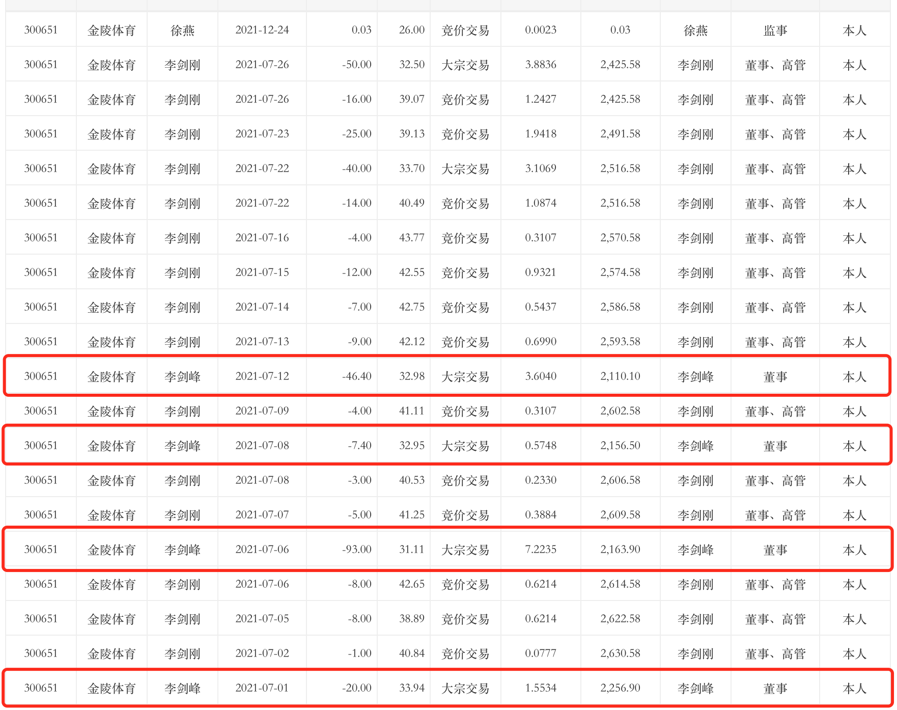 李剑峰并非首次被点名,2022年11月23日,该人士也收到来自中国证监会下发的《立案告知书》,同样是因为涉嫌短线交易“金陵体育”股票。根据2022年12月30日证监会江苏证监局下发的《行政处罚决定书》,2020年5月26日、27日李剑峰女儿李某长城证券信用账户累计买入“金陵体育”20.56万股;2020年12月22日李剑峰母亲施某华长城证券信用账户累计买入“金陵体育”4万股;2020年9月至2021年1月期间,李剑峰、李剑峰父亲李某荣、施某华按照前期公司发布的减持股份计划公告,通过大宗交易或集中竞价方式多次卖出公司股票,上述三人广发证券账户累 计卖出“金陵体育”642.0404万股;2020年12月22日至2021年1月19日,李某将前期长城证券信用账户买入的“金陵体育”卖出,累计卖出“金陵体育”数量20.56万股。自2020年5月26日至2021年1月19日期间,李剑峰、李某、施某华、李某荣多次买卖“金陵体育”,区间内违规成交股数为24.56万股,违规交易金额为717.4006万元。
