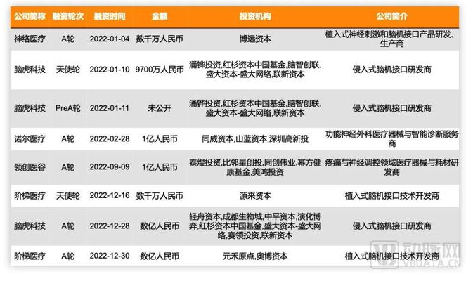 脑机接口领域部分早期投资,数据源于动脉橙