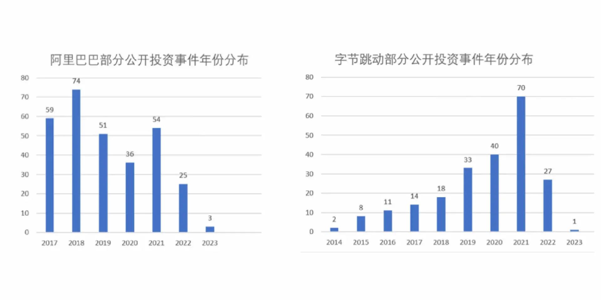 美团和字节跳动的投资不算特别亮眼,对他们来说战略意义可能是更重要的。“字节投资Musical.ly,打造了Tiktok,回头来看这个投资是超级成功的,这种地位和影响力,多少钱都换不来。”早期字节跳动的投资比较激进,充满斗志,四处出击,是一种进攻和扩张的姿态。近年来,百度和字节的投资就变得主要服务于主业了。