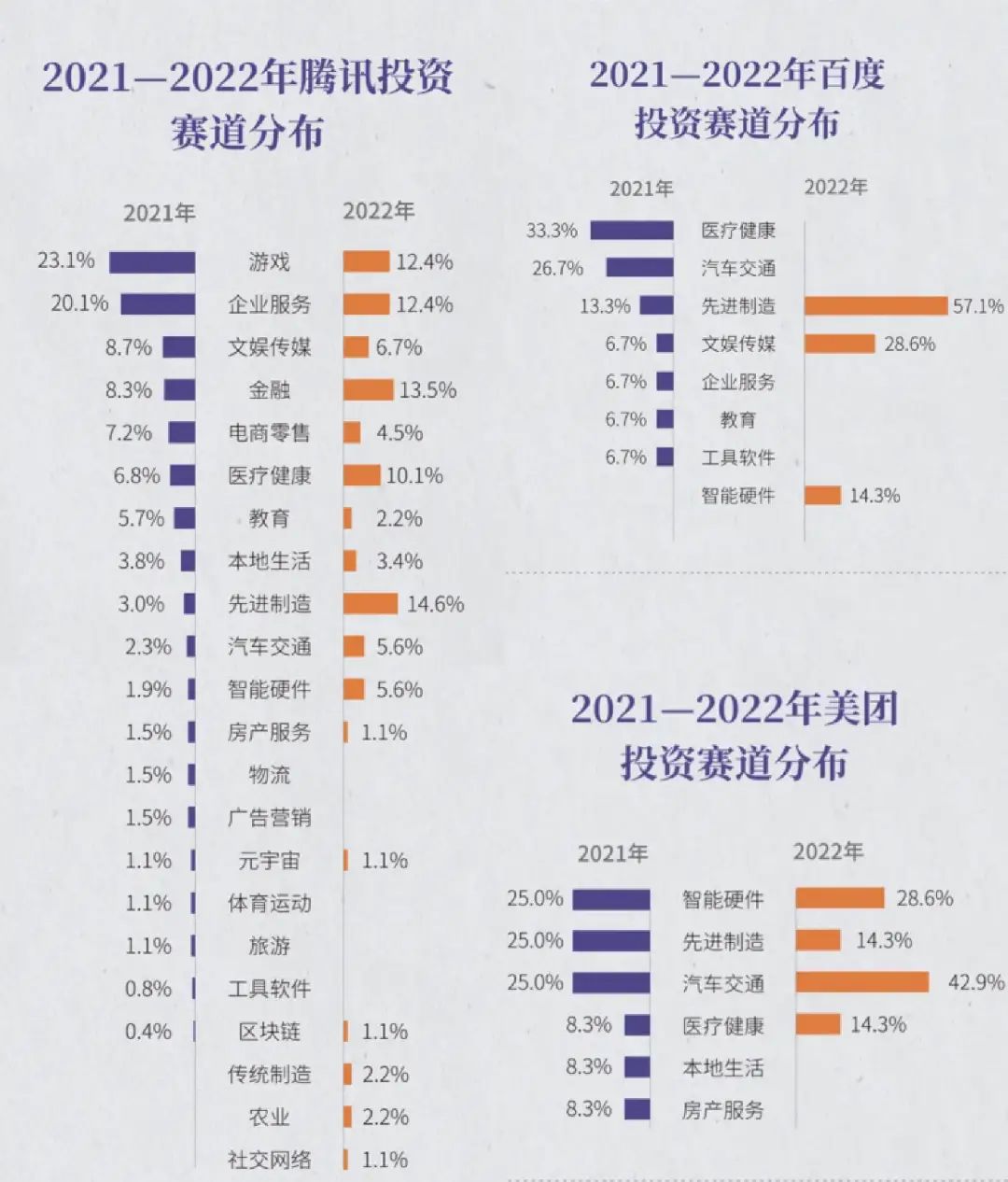 2022年,百度投资的变化也比较大,主要集中在先进制造、智能硬件和文娱传媒领域,而在2021年,百度投资最为密集的两个行业是医疗健康和汽车交通。