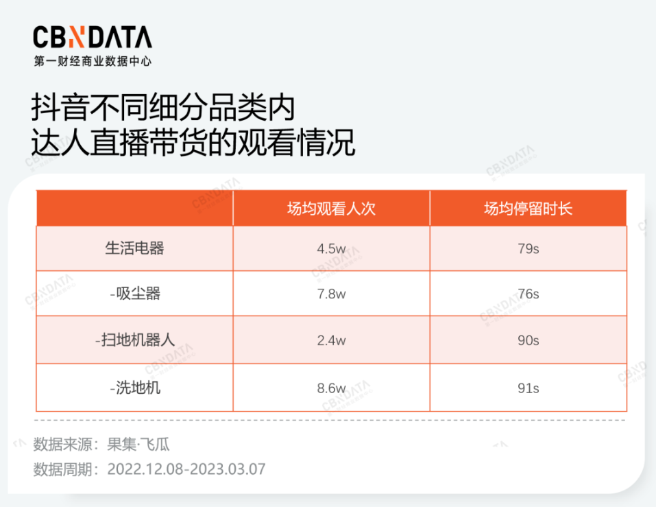 更直接的直播带货环节,破圈趋势同样有所体现。达人直播不仅意味着销量本身,还代表着品牌辐射到的人群范围。智能清洁家电品牌通过大量绑定科技、家居、生活、穿搭、母婴等多领域的腰尾部达人,触达更多用户,提升品牌声量。果集·飞瓜数据显示,以场均观看人次或场均停留时长为衡量标准,扫地机器人、洗地机的达人直播更能吸引观众,远胜于生活电器大类以及吸尘器这一相对成熟的品类。自播阵地内,多数品牌批量开设出自播间进行长时直播。在划分自播间时,无论是类似追觅以品类为主要依据,还是类似添可以经销商为主要依据,都可以帮助品牌针对性触达不同地域、圈层、消费水平的用户。