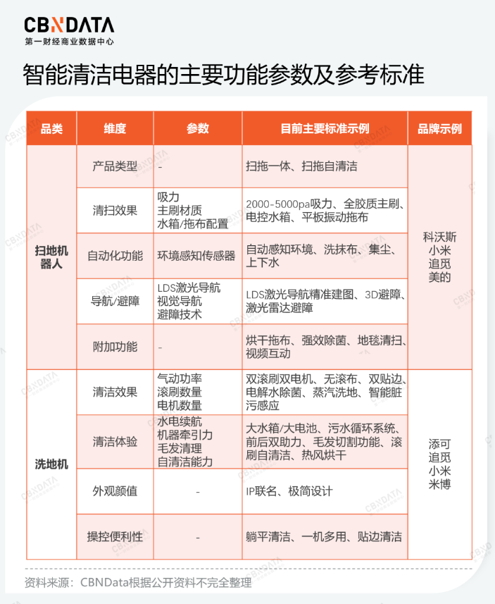 让机器变得更聪明、尽可能模仿真人打扫,是产品功能迭代的另一个方向。由于家庭不同区域的布局、脏污程度不同,智能清洁电器也应具备调整能力。例如,针对厨房、卧室、客厅、餐厅,部分扫地机器人可对应设置不同程度的吸力、湿度、清洁次数,进行个性化清扫;多数洗地机配备了多合一刷头,能够协助清理床面、沙发、窄小缝隙,应对多场景的清洁诉求。