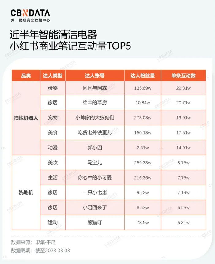 根据CBNData观察,不少品牌在内容种草环节,会密切合作美妆时尚、家庭生活、萌宠类达人,精准锚定时尚丽人、母婴用户、独居女性等用户群体。果集·千瓜数据显示,扫地机器人、洗地机在进行小红书投放时,互动量TOP5商业笔记横跨多个博主类型,笔记内容围绕沉浸式护肤、高质量居家、送礼、治愈等主题展开。在CBNData联合Yigrowth发起的“归流·2023消费品牌流量营销年度观察”主题直播中,追觅科技中国区副总经理郭人杰表达了类似的观点:由于洗地机的渗透率较低,如果局限于已有用户进行种草,会造成越来越卷的状态,所有品牌都应该重视破圈这件事,比如联动美食、旅游、健康博主进行种草,寻找圈层以外的消费者。