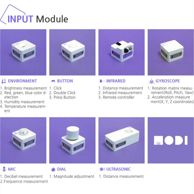 MODI 由13个组件构成,可分为输入组件、输出组件以及设置组件。