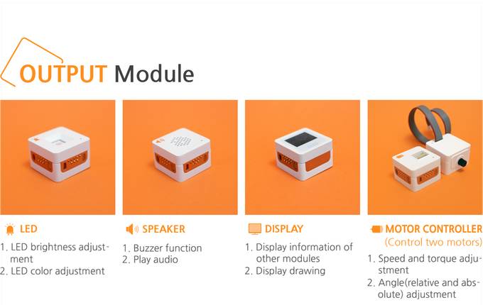 输出组件由:LED灯、扬声器、显示器、以及电动机构成。