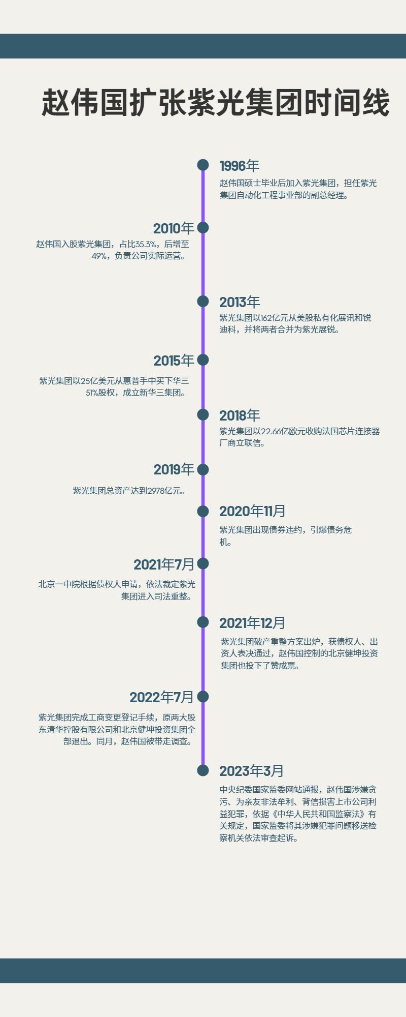 2002年之后,赵伟国进入能源、地产等领域,并在2005年创立北京健坤投资集团。2010年,赵伟国入股紫光集团,占比35.3%,后增至49%,负责公司实际运营。