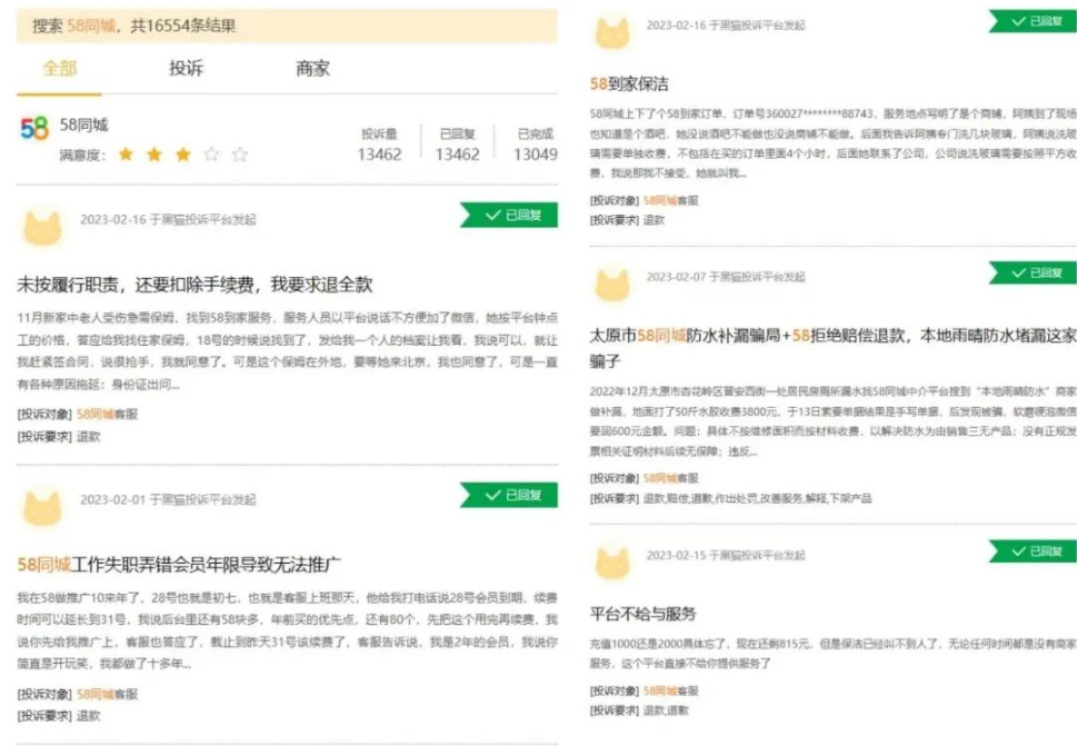 锌刻度也从黑猫投诉上查询发现,与58同城相关的投诉超过了16000条,内容覆盖了求职、招聘、出租、出售等多个本地生活服务项目。面对这些投诉,58同城的回复率还算较高,但仍能从不少投诉者处了解到,其回复的内容大多重复,并不能起到解决问题的根本作用。