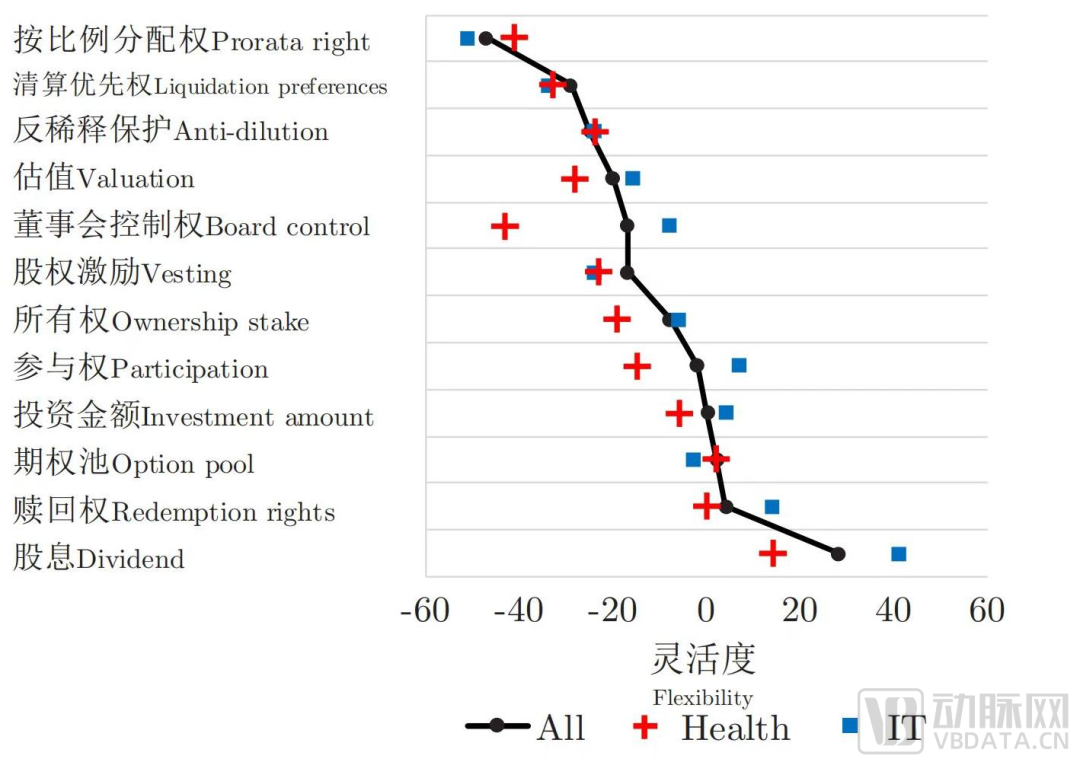 此外,调查还发现,投资医疗健康行业的风投公司在许多条款上的灵活性明显不如投资IT行业的风投公司高。除了我们已经在前面讨论过的不太会变通的按比例分配权、清算优先权、反稀释权以及公司创始人的股权激励、公司估值和董事会控制权外,投资医疗健康行业的风投公司其他控制权、估值、所有权股份和股息方面也不那么灵活。董事会的控制条款尤其引人注目,因为医疗健康领域的风投公司将其列为最不灵活的条款,而IT风投公司则相对灵活。这与医疗保健公司更容易受到内部风险(例如项目选择)的影响有关。