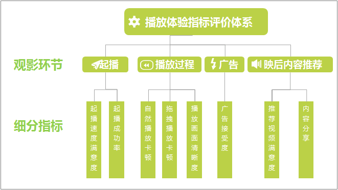 我们将其进一步拆分成四个环节:起播-播放过程-广告-映后内容推荐,然后针对各环节设定评价指标,见下图: