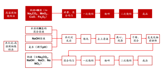 而在工艺与设备方面,钠电层状正极与锂电正极高度兼容。目前钠离子电池层状氧化物正极材料的制备工艺主要采用共沉淀-高温固相烧结法,制备工艺与锂离子电池用用三元正极材料的制备工艺类似,能沿用目前锂电正极材料的生产设备,被认为是当前最适合大规模生产钠电层状氧化物正极材料的方法。