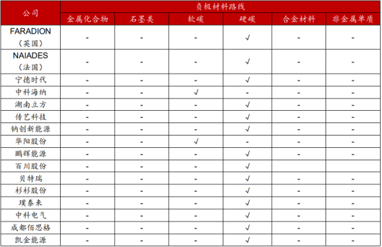 根据目前国内主流的钠离子电池生产企业披露的信息来看,各公司在布局钠离子电池负极材料的时候,大部分选择了硬碳材料,而在其余的负极材料体系,中科海纳选择了软碳材料的技术路线,其余路线由于不确定较高,目前基本没有企业布局。