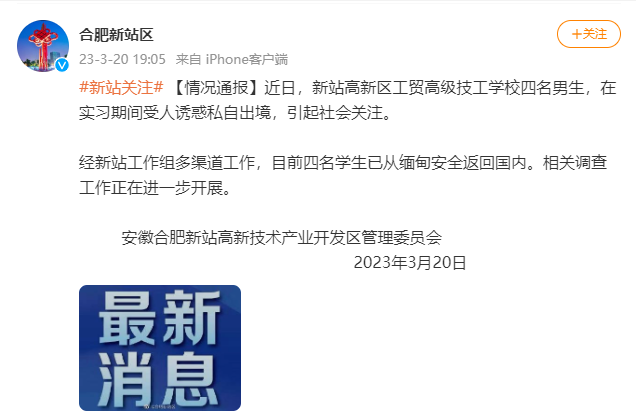 @合肥新站区 3月20日通报,近日,新站高新区工贸高级技工学校四名男生,在实习期间受人诱惑私自出境,引起社会关注。经新站工作组多渠道工作,目前四名学生已从缅甸安全返回国内。相关调查工作正在进一步开展。