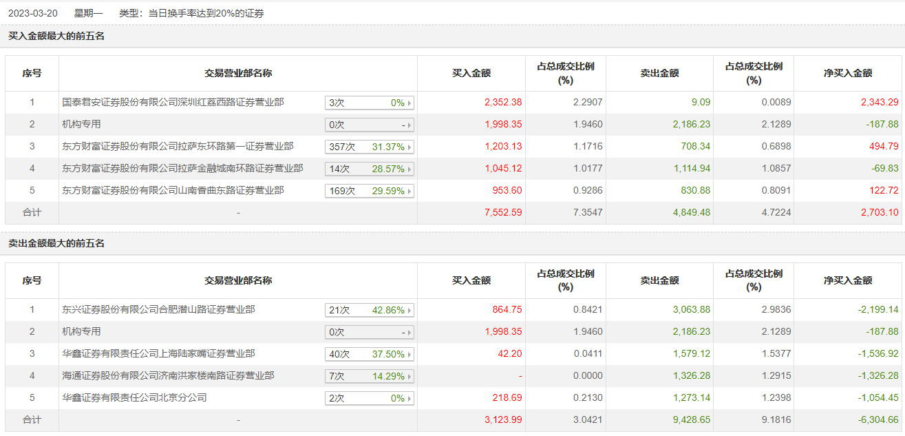具体来看,机构买入1998.35万元,卖出2186.23万元,合计净卖出187.88万元。此外,东兴证券合肥芜湖路证券营业部、华鑫证券上海陆家嘴证券营业部分别卖出3063.88万元、1579.12万元;国泰君安证券深圳红荔西路证券营业部、东方财富证券拉萨东环路第一证券营业部分别买入2352.38万元、1203.13万元。