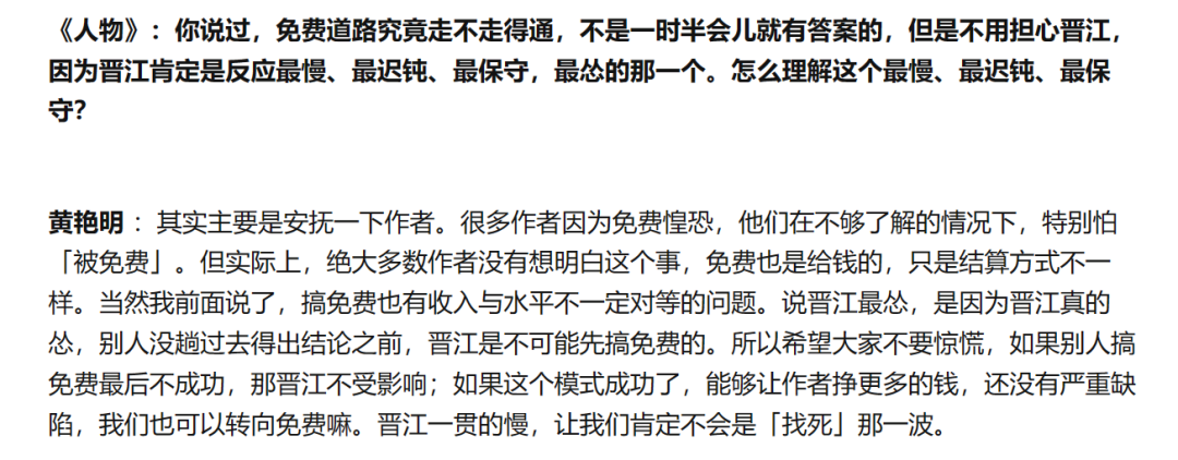 免费阅读搞得人心惶惶的时候,冰心更是以“晋江肯定是反应最慢、最迟钝、最保守,最怂的那一个”对作者进行安抚。
