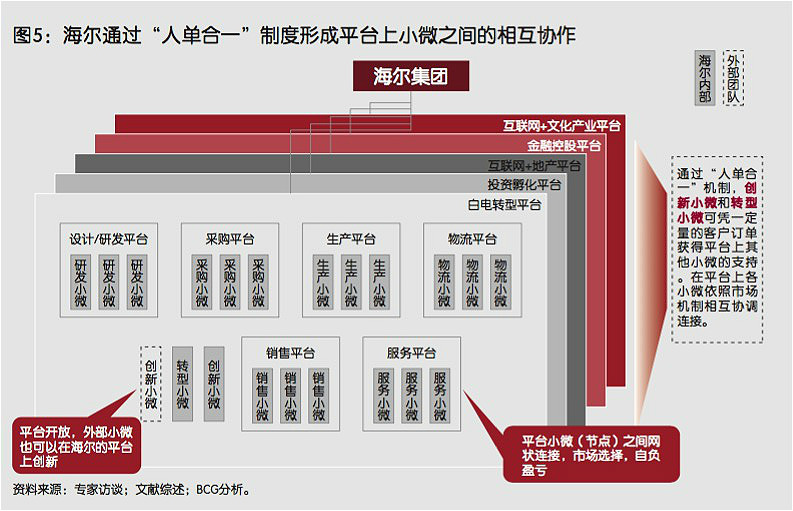 为了给小微赋能,海尔有意地打散了每个部门团队的原有架构,将其转变为相对独立的生产小组、销售小组、服务小组等,使外部的小微可以在海尔的平台上利用资源。