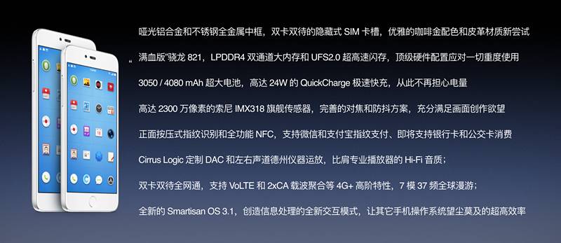 M1的硬件这次真是拼了,两款手机都支持全网通,搭载了“满血版”高通骁龙 821 处理器,其中小屏版 M1 配备了 5.15 英寸显示屏,分辨率为 1080P。大屏版 M1L 配备了 5.7 英寸显示屏,分辨率高达 2K。此外,两款手机都配备了高达 2300 万像素的索尼 IMX 318 摄像头,配有 4G/6G LPDDR4 内存,32GB/64GB 闪存。