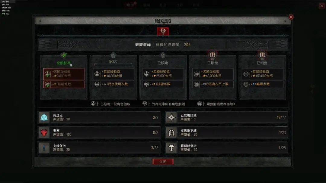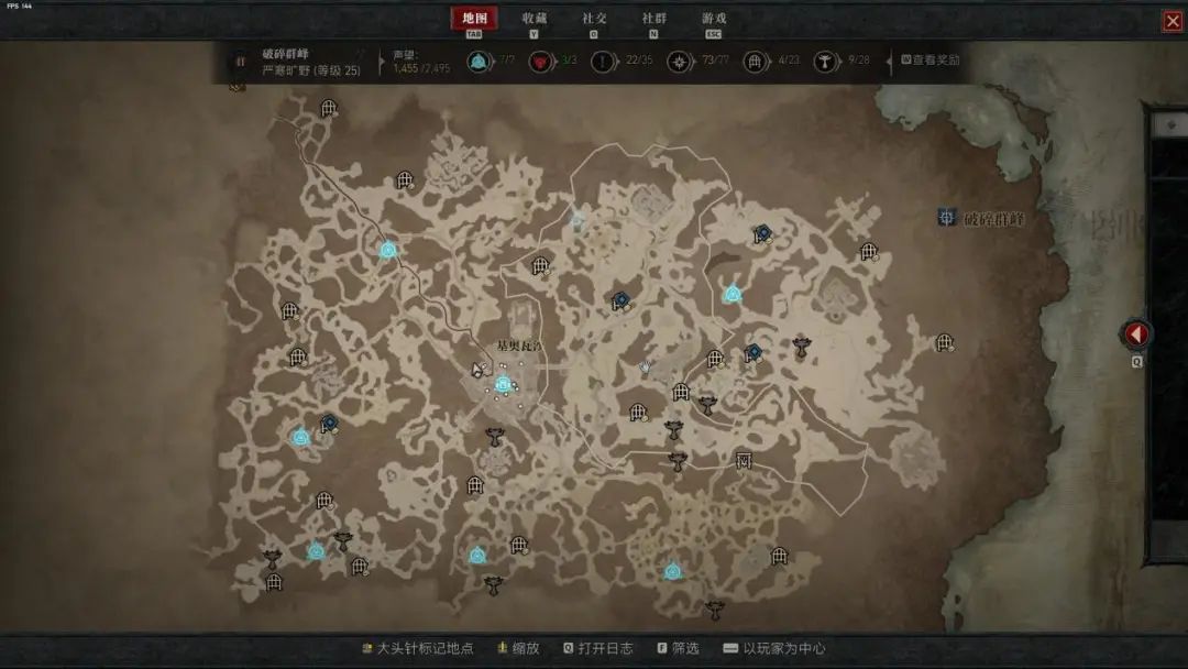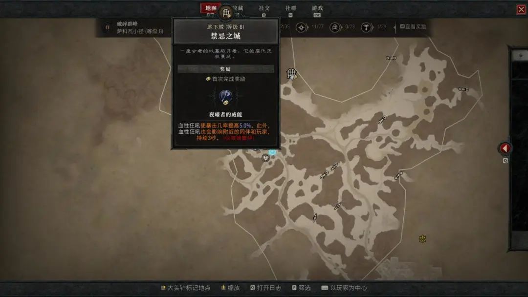 同时为了加强玩家的探索体验,《暗黑4》将探索玩法融入到了地区声望中,无论是找到传送点,发现区域还是完成支线任务探索支线地下城,玩家都能收获一定量的探索声望,并通过探索声望点数来解锁对应的奖励。就目前开测的第一张地图破碎群峰,就已经提供了35个支线任务,77块探索区域以及23个地下城。