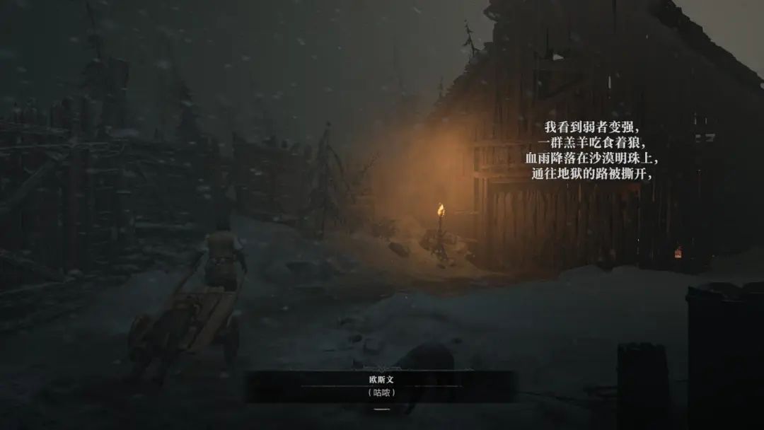 尤其是序章中被“热情好客”的村民们一顿款待,当暴风雪中村民拉着板车,嘴里哼唱着古老的歌谣,画面右侧浮现出诗歌般的字幕,那种来自邪教的怪异感觉油然而生,给我留下了深刻的印象。