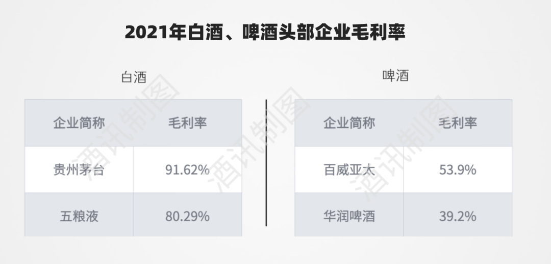 啤酒行业利润天花板摆在那里,和白酒不断拉升的利润空间相比更显紧迫。对比目前白酒和啤酒头部企业的毛利率可以看出,白酒品类的赚钱能力远远高于啤酒。2021年,白酒头部企业贵州茅台和五粮液的毛利率分别为91.62%和80.29%;啤酒头部企业百威亚太和华润啤酒的毛利率分别为53.9%和39.2%。