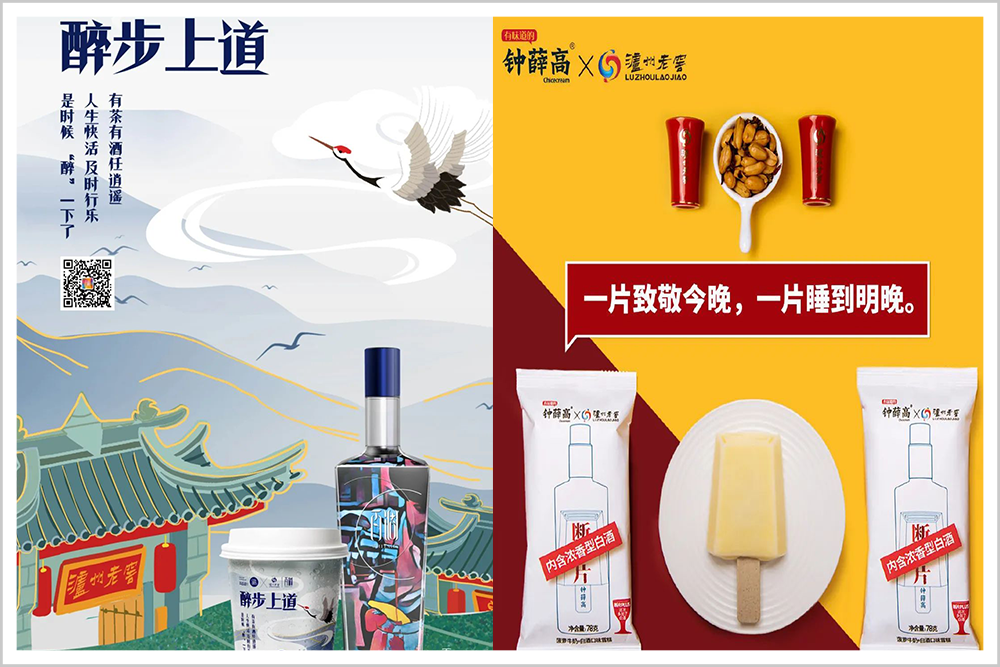 2017年8月,泸州老窖与《三生三世十里桃花》合作推出“桃花醉”;2018年世界杯、圣诞节期间,分别推出酒心巧克力足球版和星球主题酒心巧克力;2019年,与钟薛高跨界合作推出“断片”雪糕;2020年,与茶百道合作推出“醉步上道”。