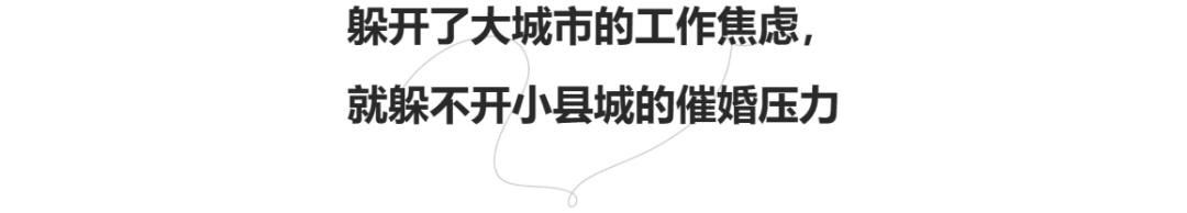 如果说,一年被催婚一次还能拿出来笑侃,那么天天被催一定会成为生命中不可承受之重。毕竟,没有几个人可以真的做到下班回家准备舒舒服服刷剧的时候,听到老妈的长吁短叹而无动于衷。小县城的年轻人,只能或与之抗争,或与之妥协。