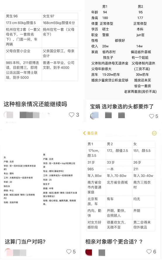 相亲是理性的选择,而爱情是感性的产物。常常见到社交媒体上,深陷婚恋焦虑的县城年轻人发帖求助。他们将相亲对象们的各项条件一一罗列,从年龄、身高、体重、颜值等基础信息,延展到家庭背景、工作性格,不一而足,有的甚至画成excel来横向对比,让素未谋面的网友帮助挑选。