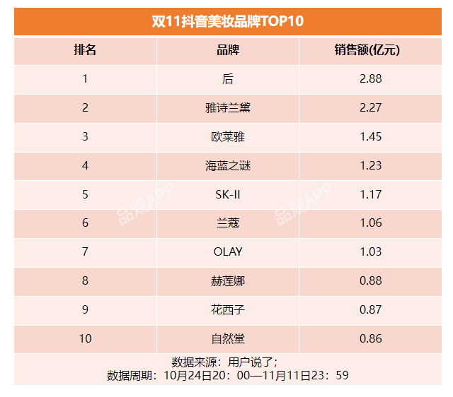 在抖音平台,国际品牌也进一步攻城略地,《双11抖音美妆品牌TOP10》榜单中的前8席位均被外资大牌占据,仅有花西子、自然堂两个国货品牌进入前10,分别居于第9、10位。从销售额来看,WHOO后以2.88亿GMV勇夺第一,雅诗兰黛、欧莱雅、海蓝之谜依次位列其后。