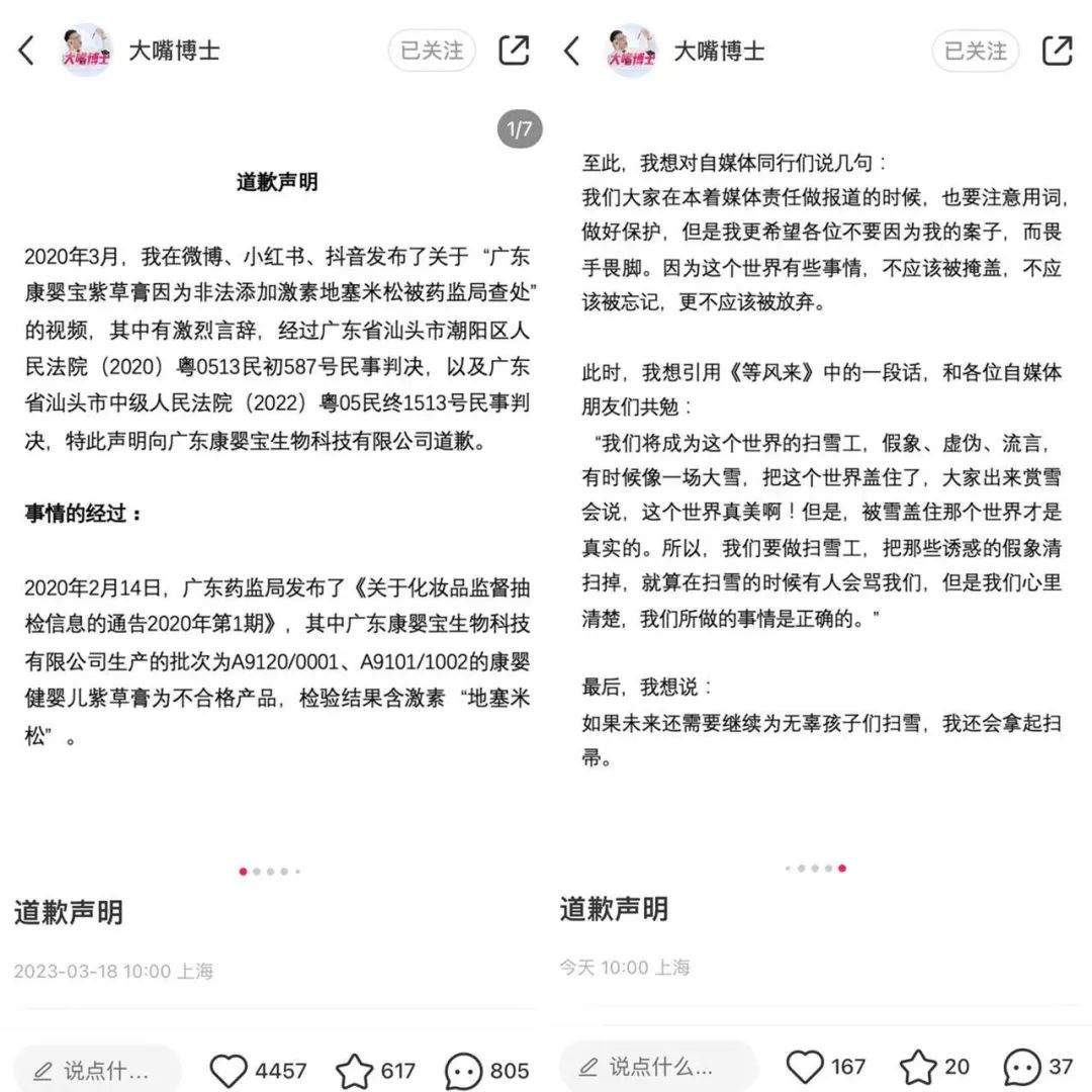 3月18号,专业美妆KOL“大嘴博士”(本名:郝宇博士)在各个平台,向广东康婴宝生物科技有限公司发布道歉声明(以下简称:康婴宝),却获得众多网友及美妆业内人士的“支持”与“赞赏”。