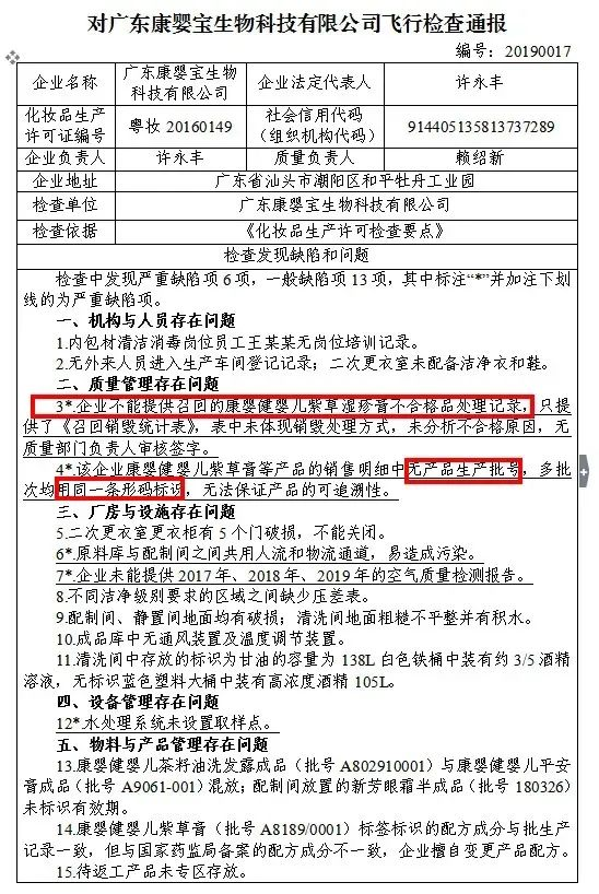 早在2019年《国家药监局关于广东康婴宝生物科技有限公司停产整改的通告》中,就曾曝光康婴宝的严重问题。