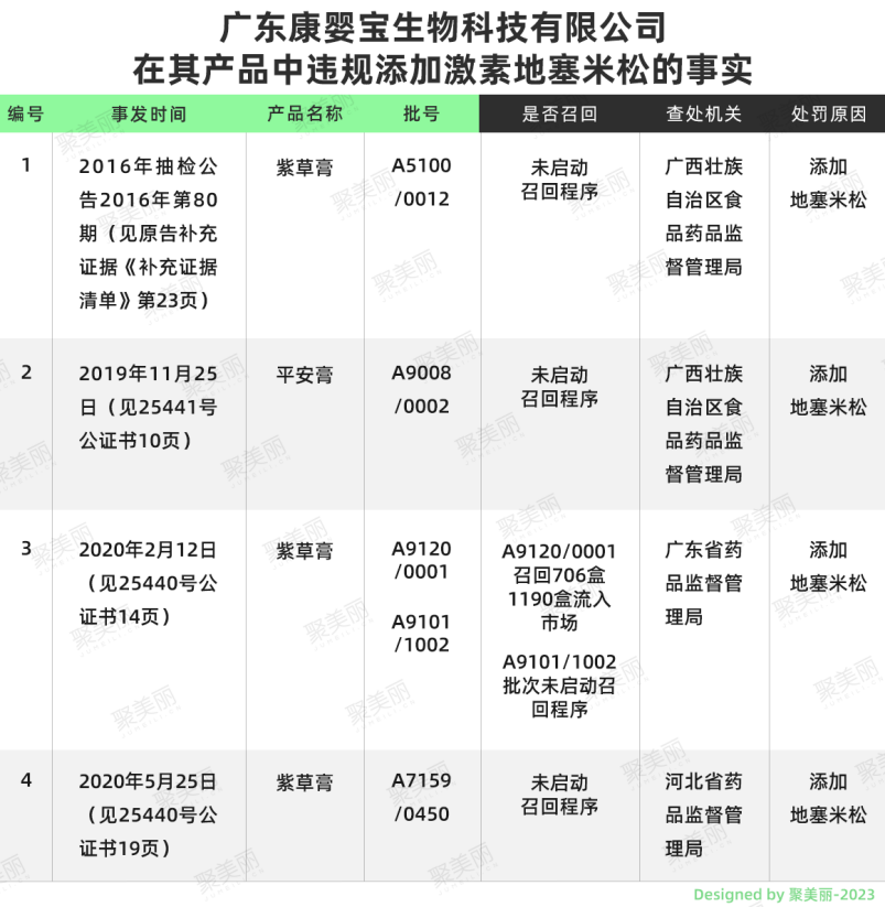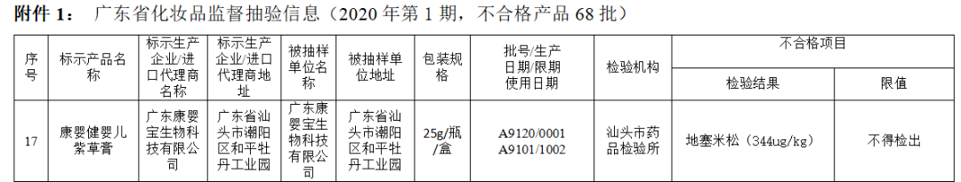 2020年2月14日,广东药监局发布了《关于化妆品监督抽检信息的通告2020年第1期》,其中广东康婴宝生物科技有限公司生产的批次为A9120/0001、A9101/1002的康婴健婴儿紫草膏为不合格产品,检验结果含激素“地塞米松”。