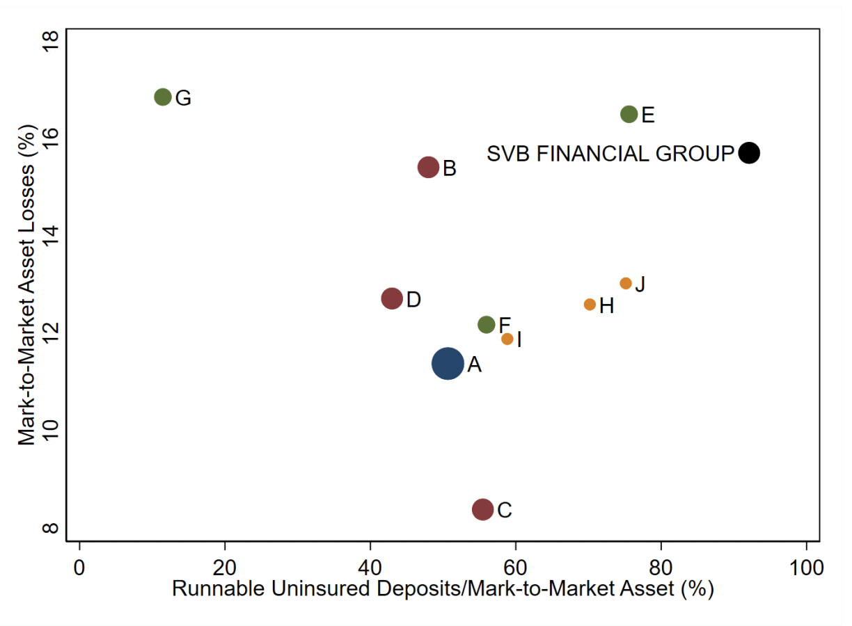 研究认为,无保险的杠杆率(即无保险的债务/资产)是理解这些损失是否会导致银行暴雷的关键。与投保的储户不同,如果银行倒闭,未投保的储户将失去部分存款,他们更容易出现恐慌性挤兑提款。如果半数未受保储户突然从这186家银行撤资,且没有政府干预、资本注入或其他救援措施,即使是受保储户也将遭受损失,或有3000亿美元的投保存款面临风险,这些银行将资不抵债、最终破产。