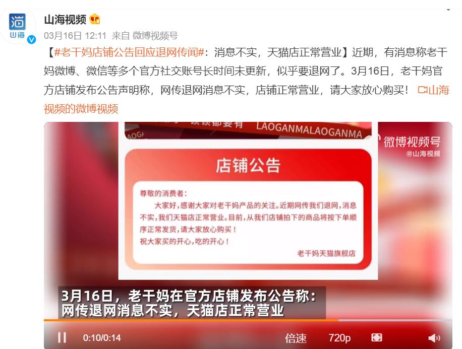 前不久因老干妈微博、微信、抖音等多个平台官方账号长时间未更新,甚至出现了老干妈退网的传闻。一个月后,老干妈天猫店才出面否认了这一传闻,并登上热搜。