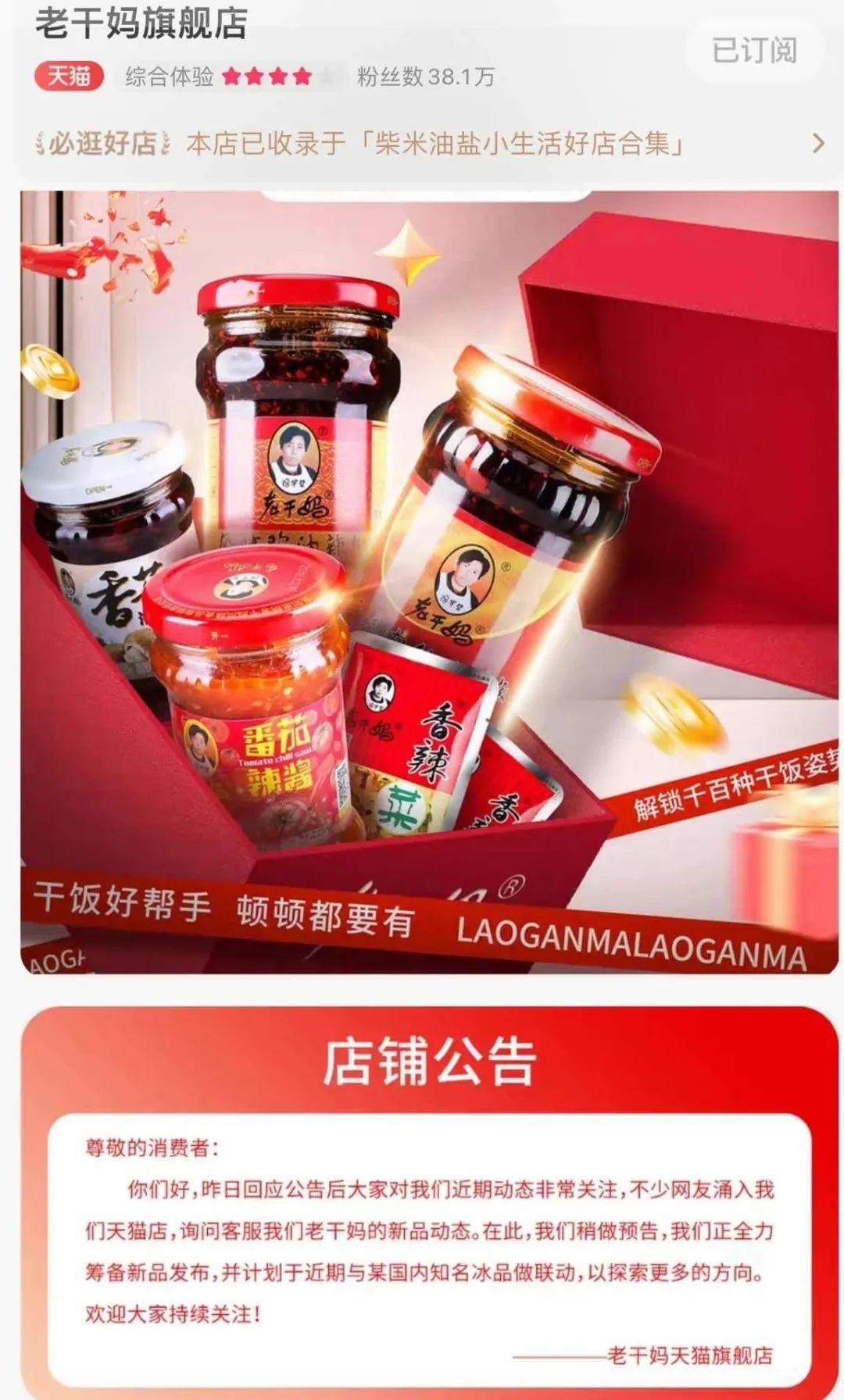 3月17日,老干妈天猫旗舰店发布公告:正全力筹备新品发布,并计划于近期与国内知名冰品做联动,以探索更多的方向。