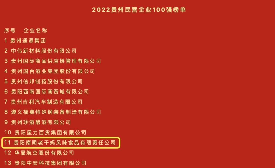 去年在贵州省工商联合会与贵州省企业联合会共同发布的“2022贵州民营企业100强榜单”里,老干妈以42.01亿元的营收额,位列第11位,而在2017年和2018年榜单中,老干妈还维持在第5位。
