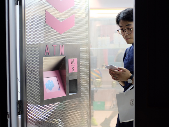 受到外墙装饰的限制,想要让赶路的匆匆行人注意到店铺,并愿意进店逛逛着实不容易。于是,钱悦找来设计工作室So Studio合作为店铺设计个性的门头。现在,门头被设计成了一个取开门钥匙专用的ATM机——为了让这个互动有意义,店铺的门会常年锁闭——顾客需要按照屏幕上显示的开门方法,关注店铺公共微信、进入开门页面、在手机上按下“开门”按钮从而打开店门。