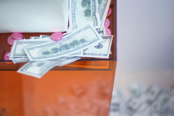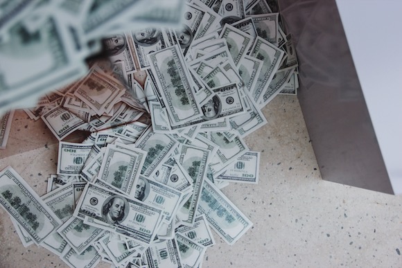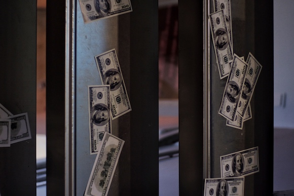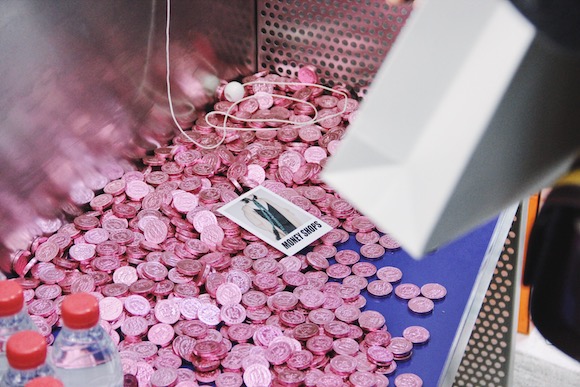 不过,这都是后话。当初之所以会选用ATM机作为门头,其实更多是因为这个意象与有Money字眼的店铺名更相关。而且等到真正进入店里逛完三层楼,绝大多数人还会有一种感觉——正是“钱”串起了这家店的三层楼,串起了店里每一种商品品。这不,店铺各个角落的展示台上洒满了粉色的巧克力钱币,“美金”也稀稀拉拉地黏在楼梯拐角、立柱、窗户上,或者干脆撒在地上。而更隐秘的钱还被做成了装饰物——在二楼到三楼之间,店主找来设计师利用绕圈的环形霓虹灯管以及镜面做出了一个“财源广进”的装置,“因为钱币就是圆形的,有了镜子就无穷无尽、循环往复了。”
