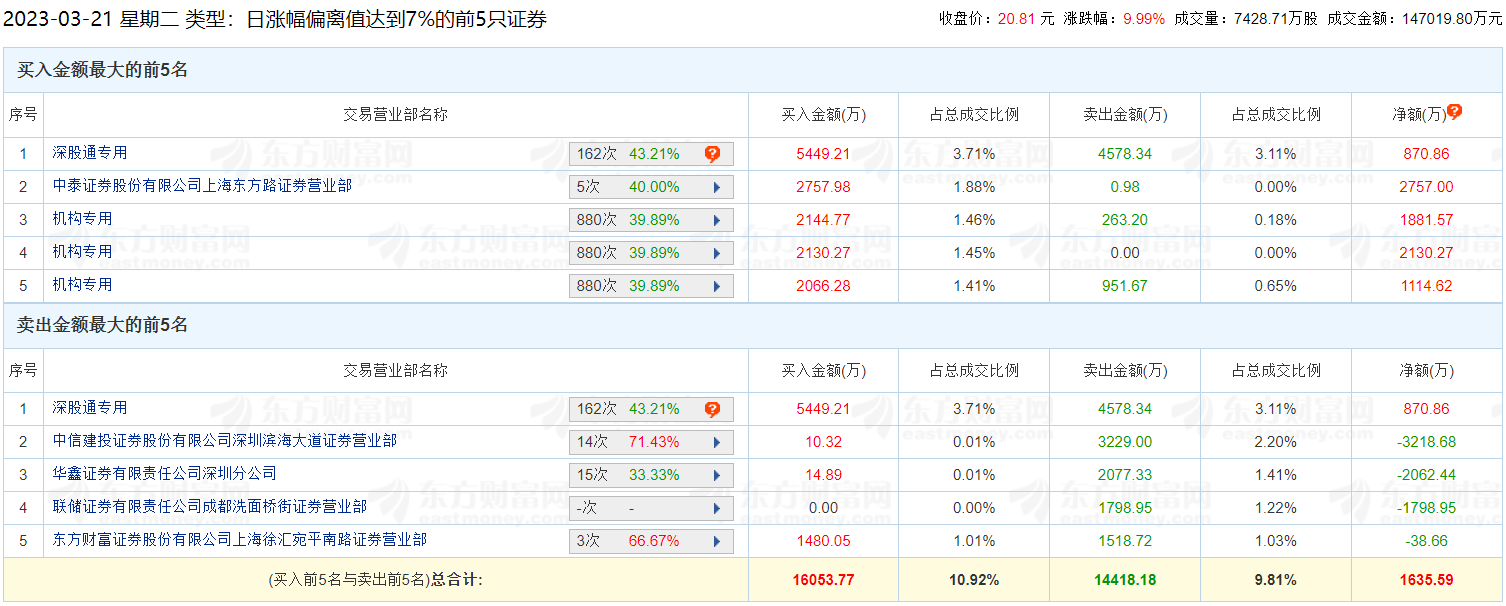 龙虎榜数据显示,3月21日共3个机构席位出现在吉宏股份的龙虎榜单上,分别位列买三、买四、买五,合计净买入5126.46万元,占龙虎榜净买额的313.43%。当日龙虎榜单上出现了深股通的身影,占据了买一、卖一的位置,净买入870.86万元,占当日成交总额的0.59%。
