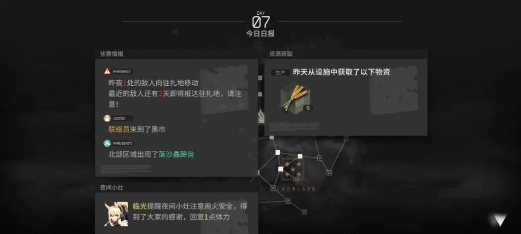 在这个活动中,玩家每天会有固定的行动点,需要玩家利用行动点进行资源收集,用食物解决干员饥饿恢复体力,制作工具加速采集速度,对基地进行建设,遭遇随机事件,遇见行货商人,抵御敌人的袭击。